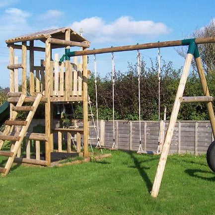UPPINGHAM PLAY EQUIPMENT is the perfect choice for an action-packed journey. It features a triple swing, wave slide, and double-width rope ladder, as well as a telescope perched atop the platform. To further fuel your child`s creativity, we have a variety of exciting play accessories.